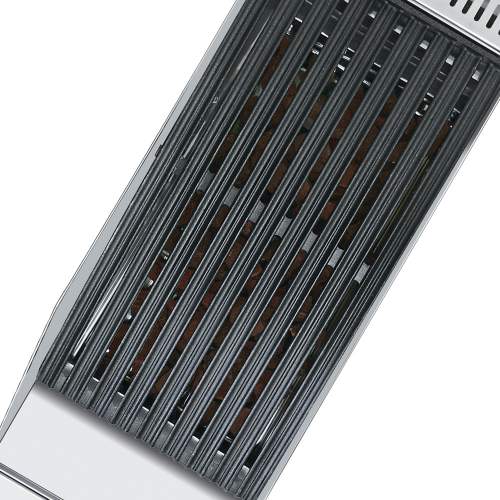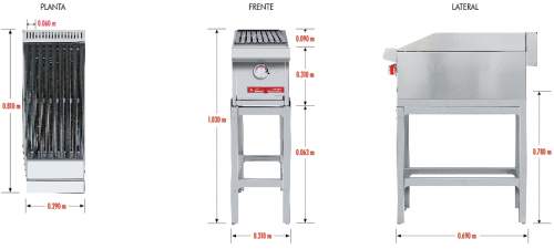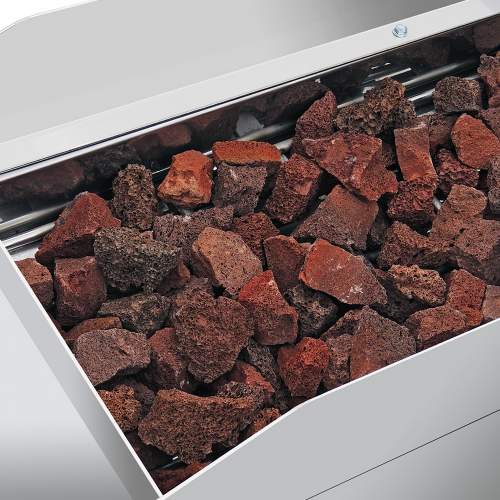 Asador con cuerpo fabricado de acero inoxidable, con partes en fundición de hierro, piedra volcánica incluida, el equipo perfecto para complementar tu linea con un asador de baja producción y rápido termino