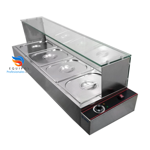 Fabricado en acero inoxidable tipo aisi 201, eléctrico a 120 volts / 60 hz /1f, 4 insertos medios de 10 cm de fondo con tapa incluidos, resistencia de 1000 watts.