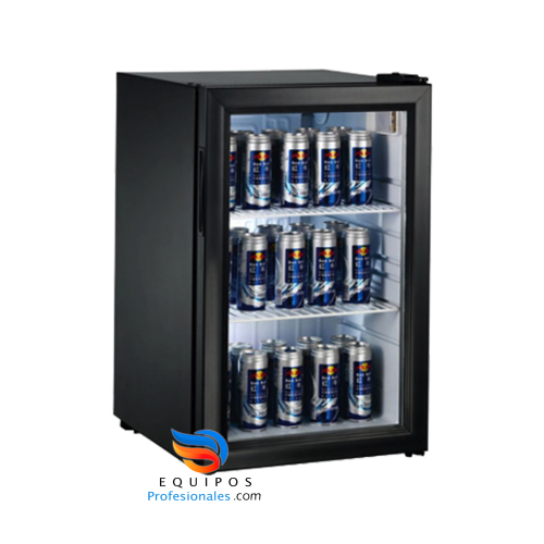 respaldo posterior externo en a.alum., 1 puerta de cristal, 3 parrillas plastificadas en el interior, iluminación LED, 1 condensador estático, 1 compresor con refrigerante ecológico,