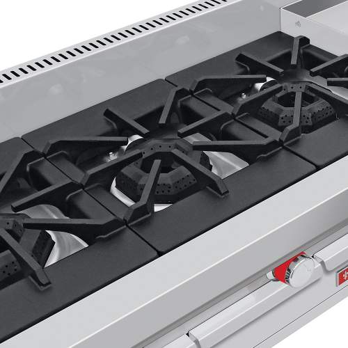 • 3 parrillas superiores en hierro fundido montadas sobre cubierta semi-sellada.