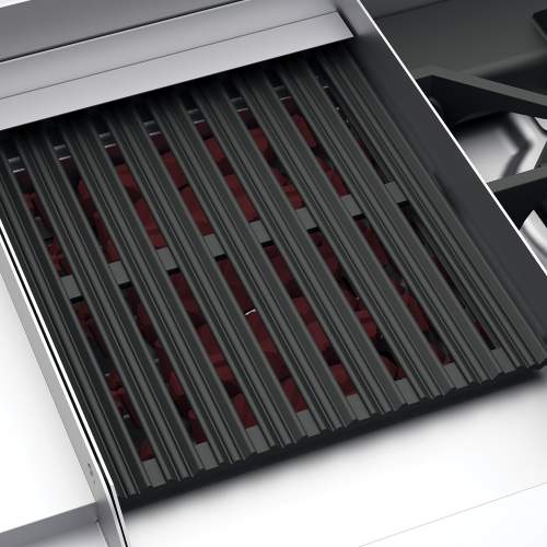 • 2 parrillas superiores en hierro fundido montadas sobre cubierta semi-sellada.