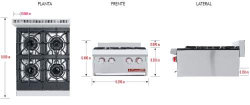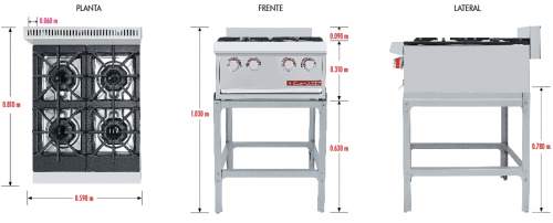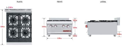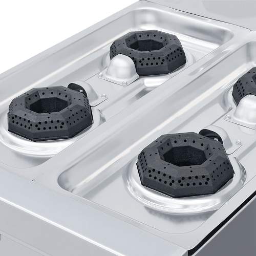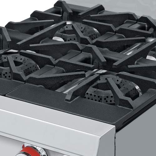 Parrilla de 4 Potentes quemadores, octagonales fabricados de fundición de hierro y mueble fabricado en acero inoxidable ideal para espacios recucidos y una producción de mínima a pequeña