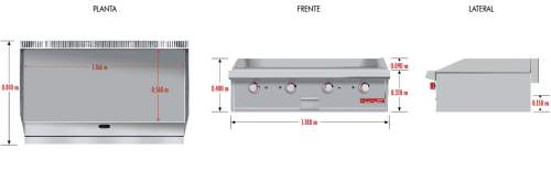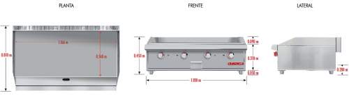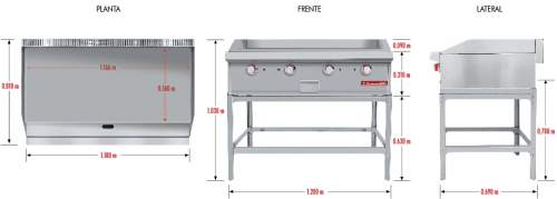 Plancha cold rolled steel de 3/4" de espesor con área útil de: frente:1.166 m, fondo: 0.560 m 3 quemadores en "u" en acero inoxidable. 1 charola para recolección de aceite. Ideal para restaurantes que ofrecen una gran producción